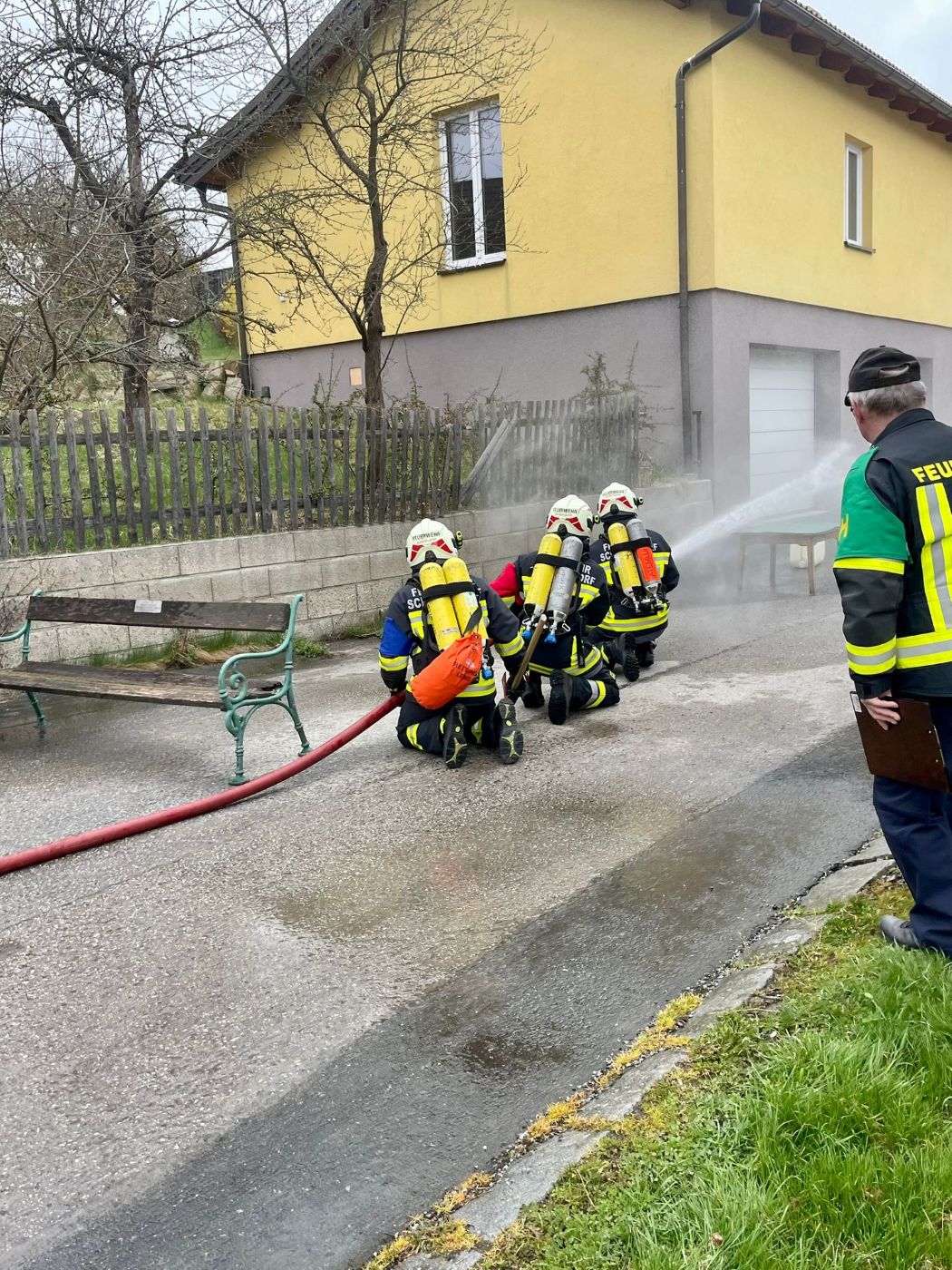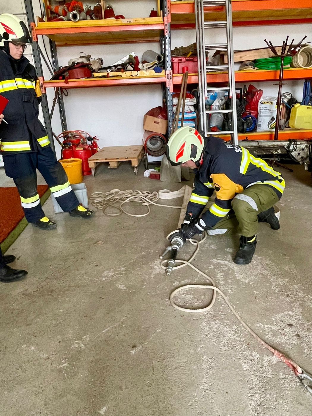 Begonnen wurde mit dem Durchgang in Bronze. Zuerst erfolgte die Abfrage der Gerätekunde am eigenen LFA-B. Danach musste man sein Wissen in der Knotenkunde und Erste Hilfe zeigen, ehe man mit dem eigentlichen Löschangriff beginnen durfte. Dabei ging es nicht um Geschwindigkeit, sondern um die präzise und sichere Ausführung des Löschangriffs durch eine Tür mit Hindernis.