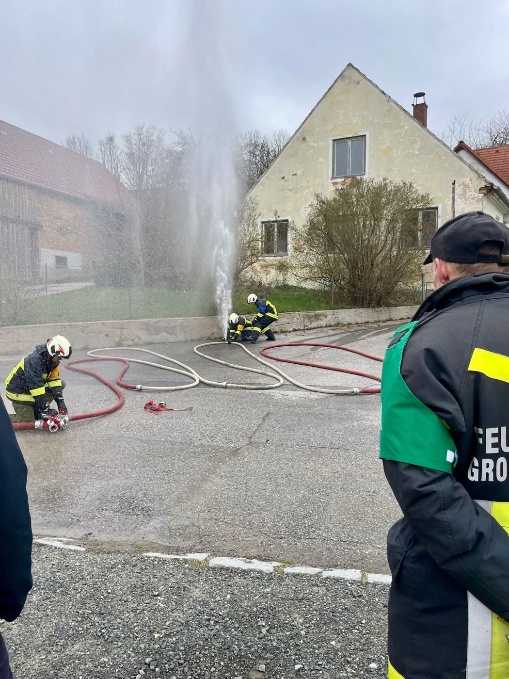 Als nächstes war der Durchgang in Silber an der Reihe. Die Aufgaben waren dieselben, doch die Funktionen wurden per Zufallsprinzip gezogen. Die Gerätekunde, Knotenkunde und Erste Hilfe-Kenntnisse waren erneut tadellos. Beim Löschangriff funktionierte anfangs auch alles nach Plan...bis es plötzlich zu einem unerwarteten Schlauchplatzer kam. Ohne Vorankündigung trat ein Materialversagen auf und das Wasser spritzte in einer knapp 10 Meter hohen Fontäne in die Luft. Doch die Reaktionen waren schnell und ein Reserveschlauch wurde eingesetzt, sodass man noch innerhalb der vorgegeben Zeit den simulierten Brand bekämpfen konnte.