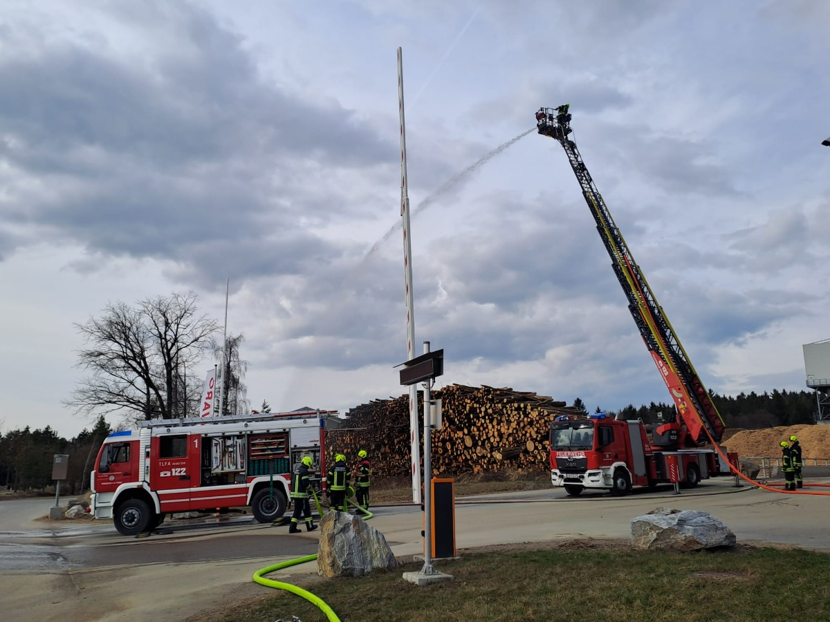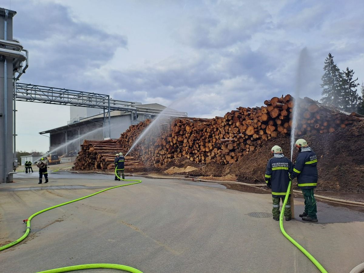Übungsannahme war ein Großbrand beim Pelletswerk mit mehreren vermissten Personen. Der Brand sollte von unterschiedlichen Richtungen über diverse Wasserentnahmestellen gelöscht werden.